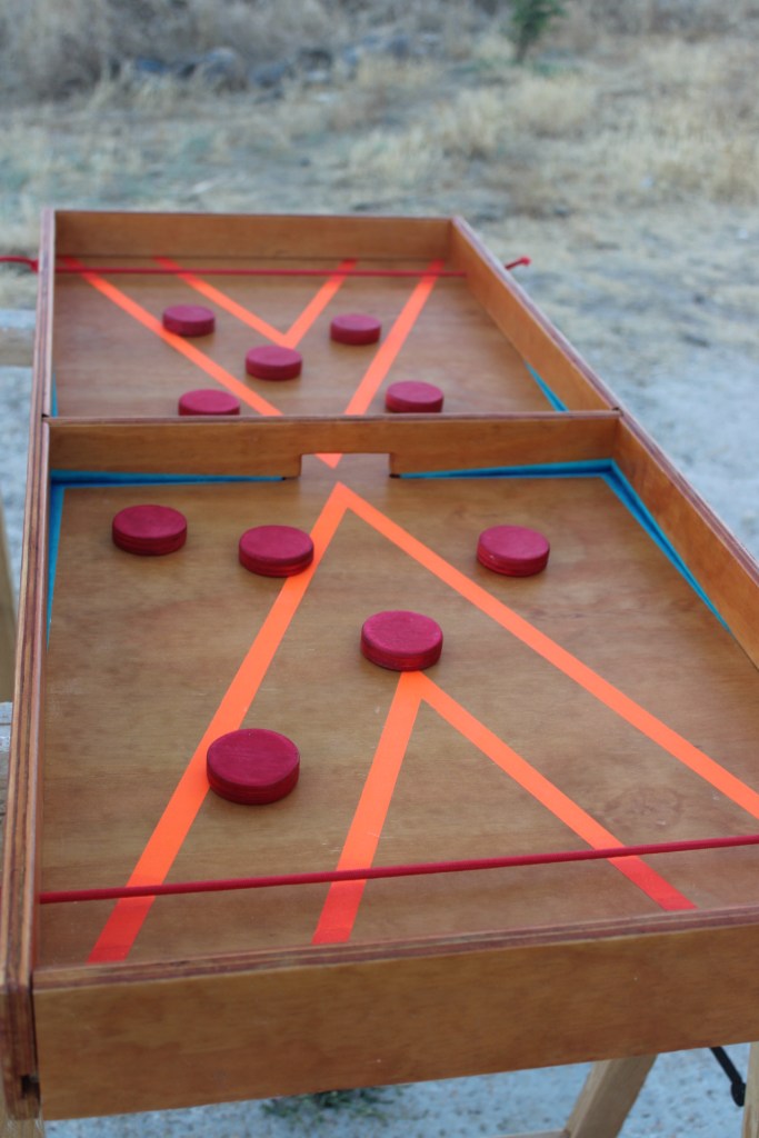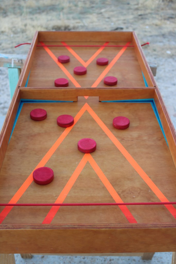 Concurso de pallets: Dimensión: 110x 44. Edad recomendada: De ocho años en adelante. Dos jugadores. Reglas del juego: Se trata de dejar tu campo sin pallets lo más rápido posible, usando los elásticos para propulsarlos. No hay turno, se juega de forma simultánea. Un juego de rapidez muy excitante, que llevará tu emoción al máximo.