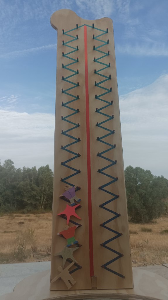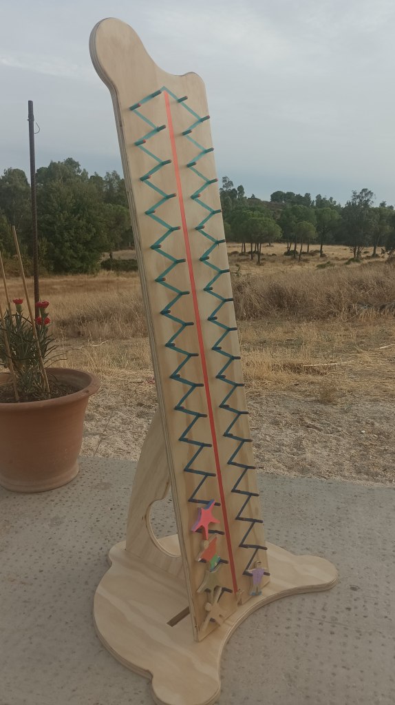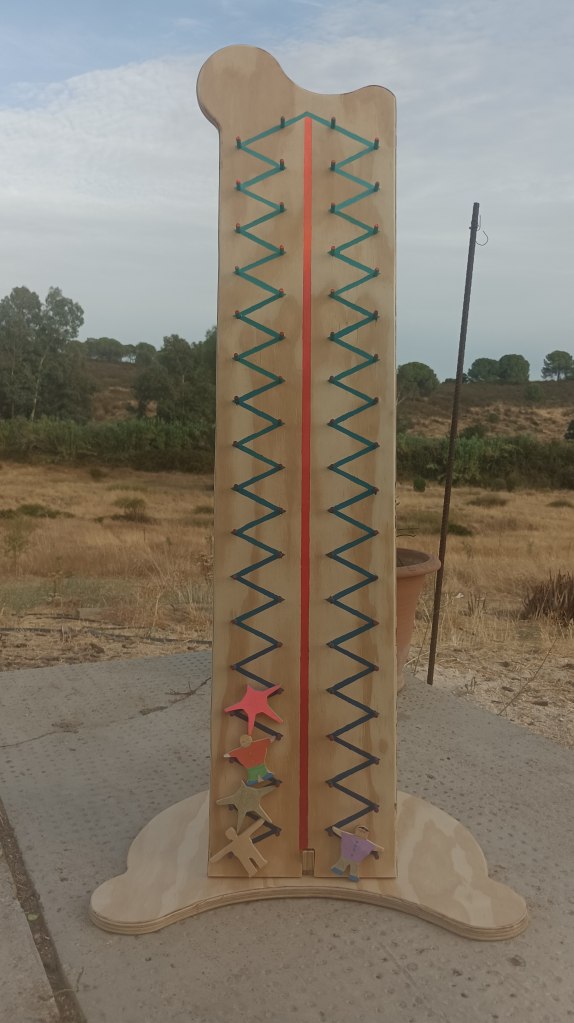 El tikitaka: Dimensiones: 140x 40cm. Edad recomendada: De uno a siete años. Un juego hipnótico para los más pequeños. Suelta los personajes a lo alto de la escalera y observarlos caer. Puedes hacer carreras e intentar que no se alcancen. Un juego muy visual para despertar la imaginación.