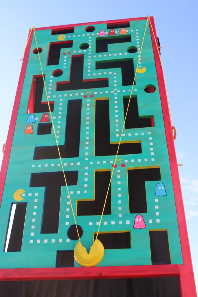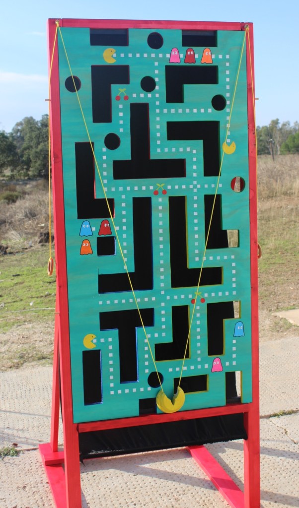 Packman: Dimensión: 180×80. Edad recomendada: De seis años en adelante. Uno o dos jugadores. Reglas: Utiliza ambas manos para subir la pelota sin que se caiga por los agujeros. Si se juega entre dos, cada jugador sujeta un extremo de la cuerda. Un juego de habilidad, paciencia y comunicación..