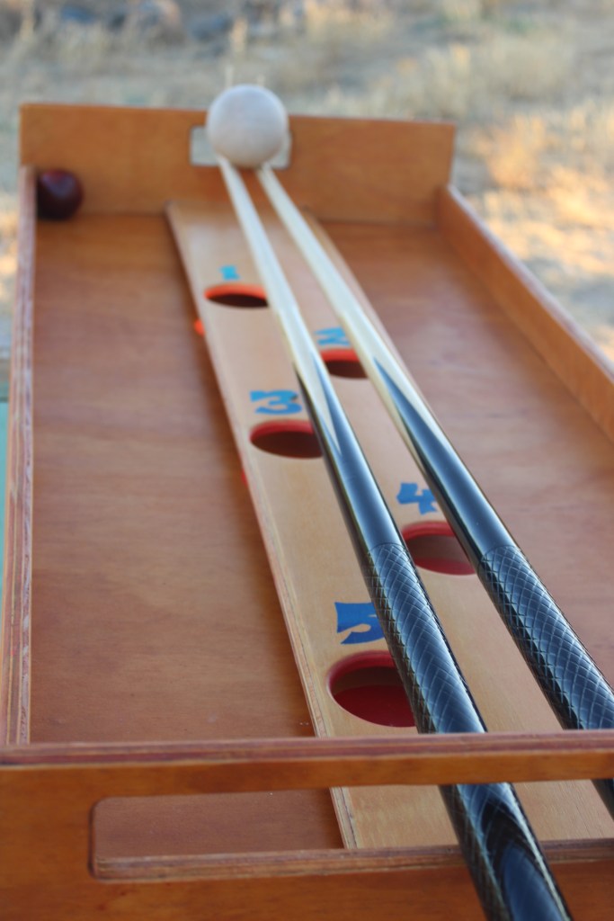 Billar a dos manos: Dimensiones: 110x 40. Edad recomendada: De cinco años en adelante. Un solo jugador. Reglas del juego: Abriendo las varillas la pelota viene hacia ti. Se trata de dejarla caer en uno de los agujeros, siendo 5 la máxima puntuación. Juego de habilidad y precisión. Que pone a prueba tu conocimiento de la física.